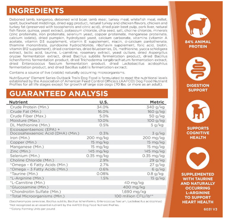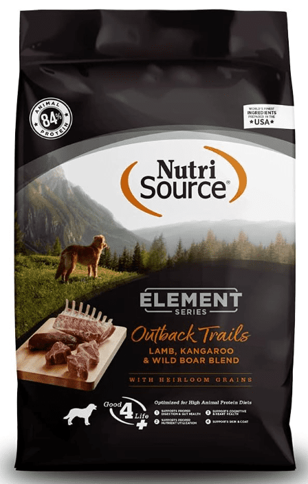 • Animal ingredients provide 84% of the protein in NutriSource Element Series Outback Trails Lamb, Kangaroo & Wild Boar Blend.