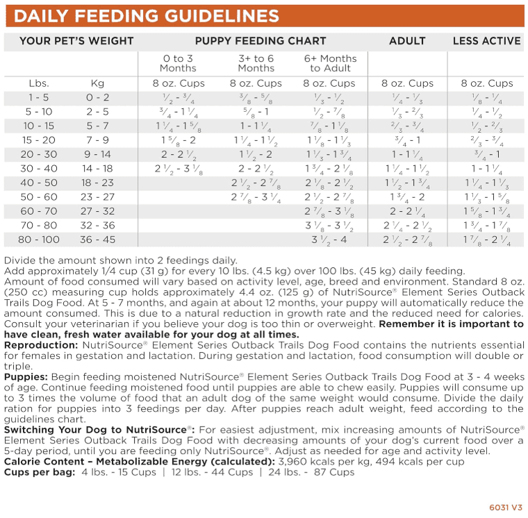 • NutriSource Element Series Outback Trails is formulated to meet AAFCO guidelines for all life stages.